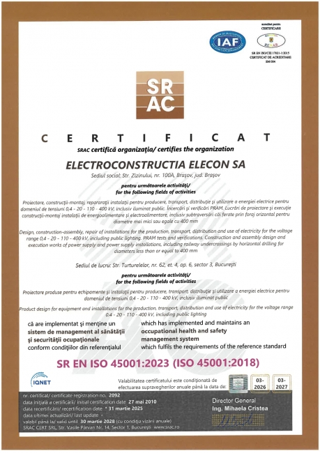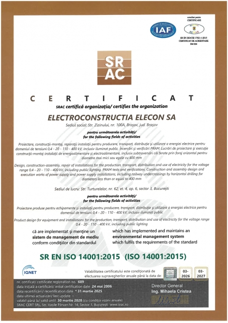 Also in order to perform operations and services, our company has an ANRE certificarte for the design and execution from 0.4 kV to 400 kV as follows:
