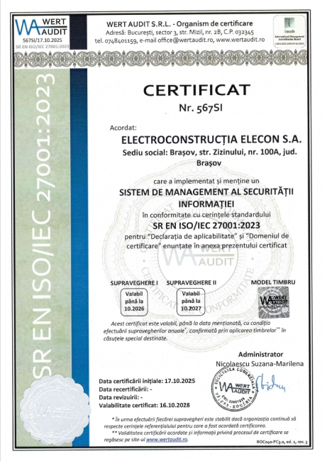 Societatea noastră deține următoarele certificări recunoscute la nivel internațional, care confirmă respectarea celor mai înalte standarde în domeniul calității, mediului și securității ocupaționale: